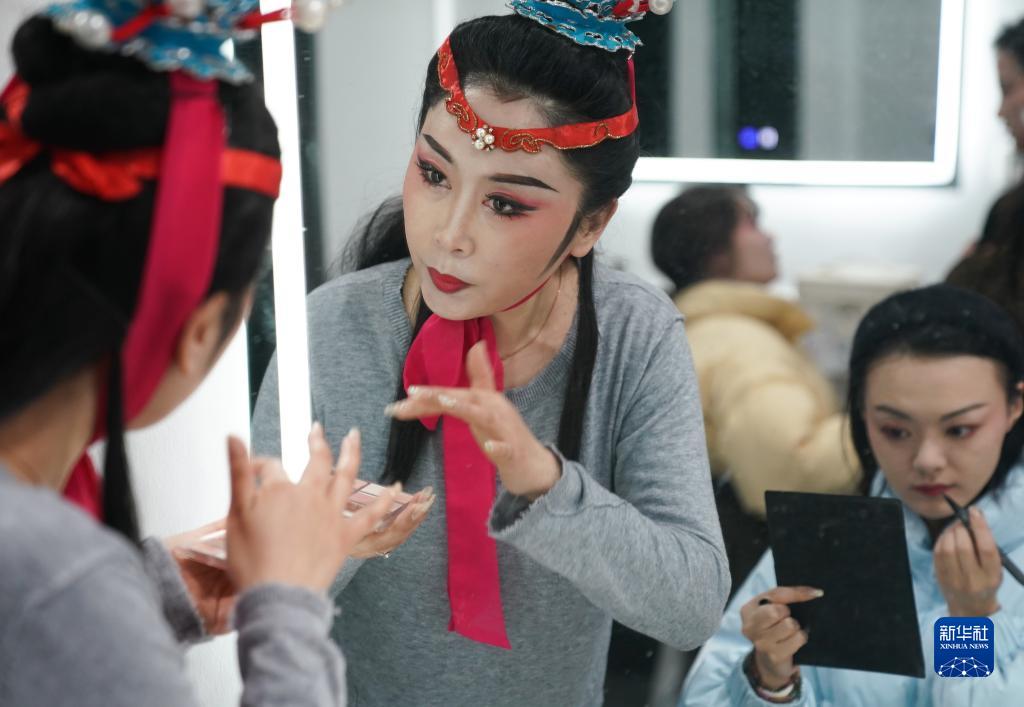 2月4日,在盱眙縣江淮劇場,演員演出前化裝。