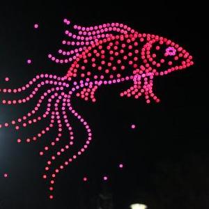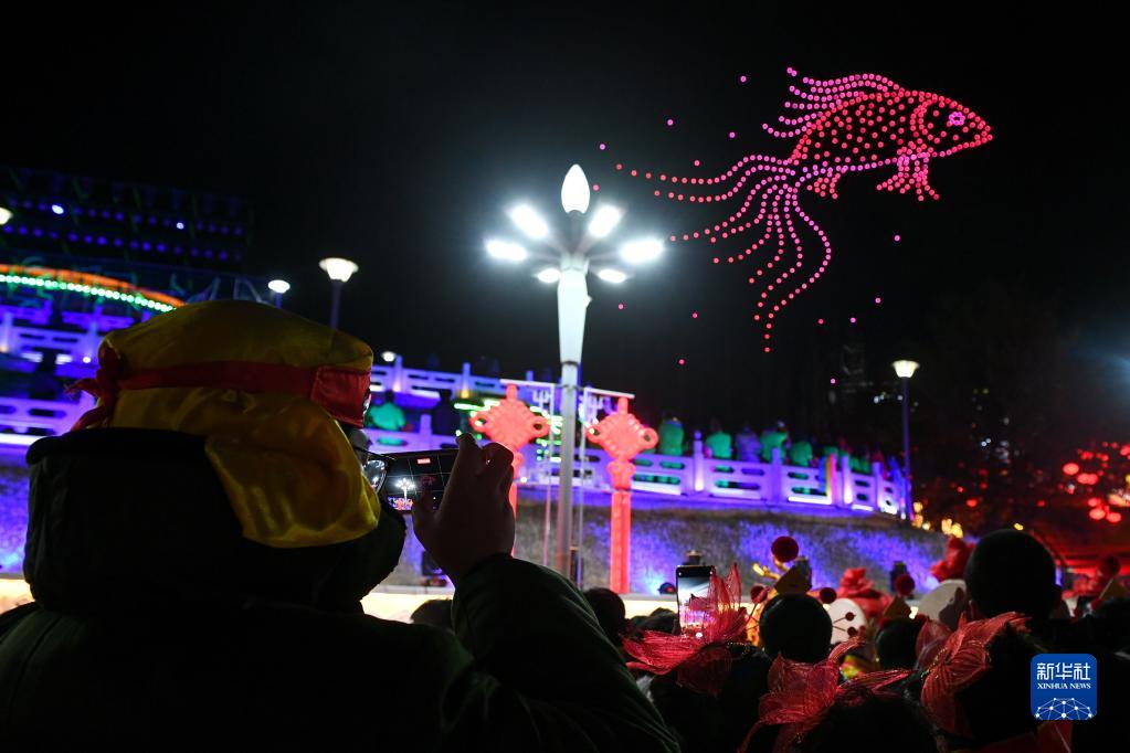 2月4日,在卓資縣九曲廣場,游客使用手機拍攝無人機演出。