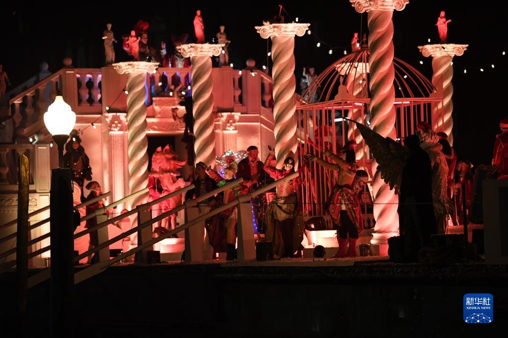 2月4日,在意大利威尼斯,演員參加水上巡游表演。