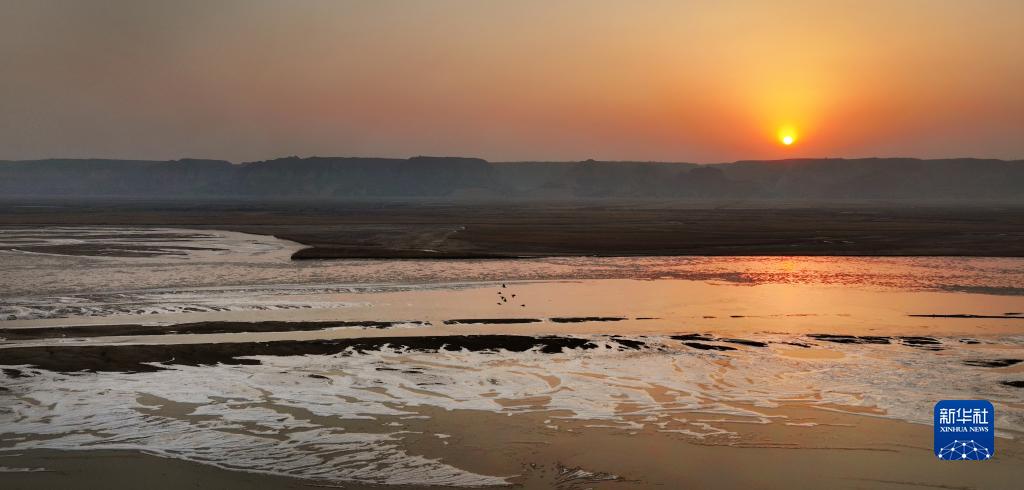 2月3日,黃河西岸的合陽黃河濕地自然保護區內,太陽緩緩升起(無人機照片)。