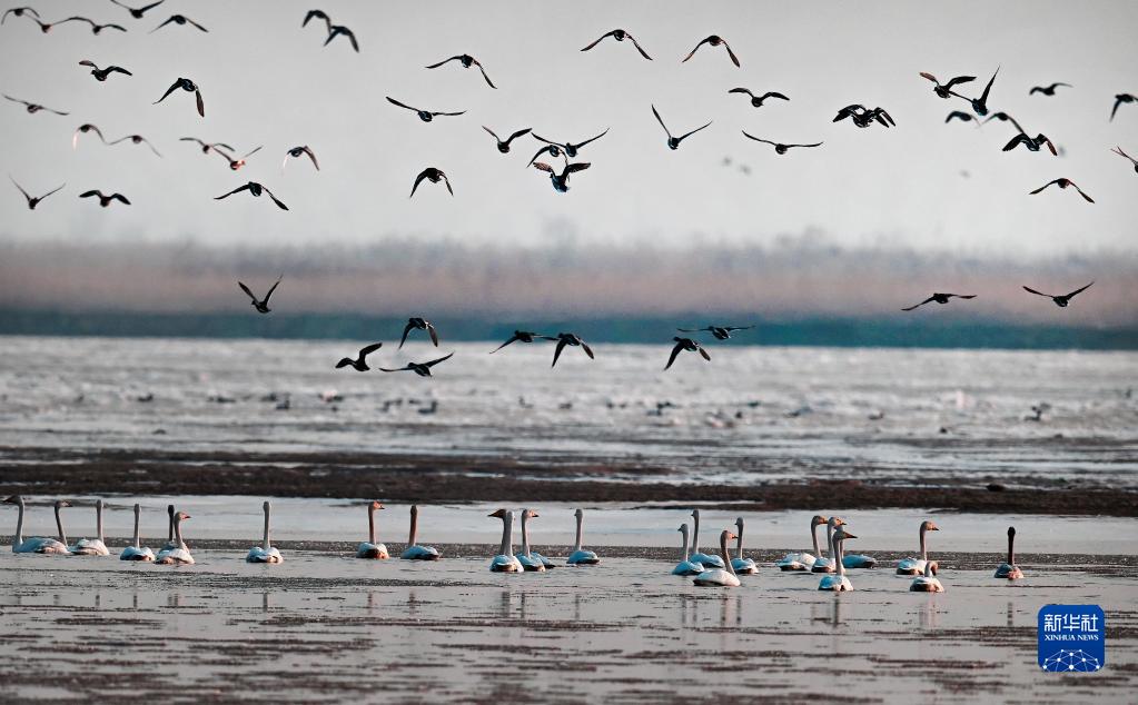 近日,黃河西岸的合陽黃河濕地自然保護區內,天鵝今年首次規模出現,數量近千只。