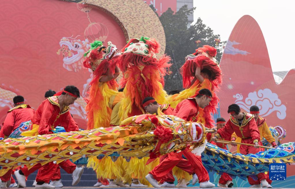 2月5日,在四川省瀘縣人民廣場,瀘縣玄灘鎮龍舞代表隊表演《龍騰獅躍》。