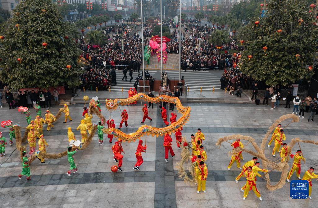 2月5日,四川省瀘縣各鄉鎮的20支龍舞隊伍齊聚縣城人民廣場表演舞龍(無人機照片)。
