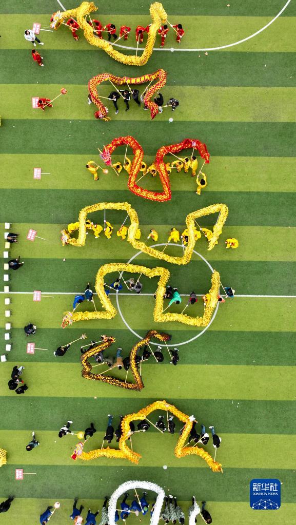 2月5日,村民們在貴州省遵義市湄潭縣黃家壩街道表演舞龍(無人機照片)。