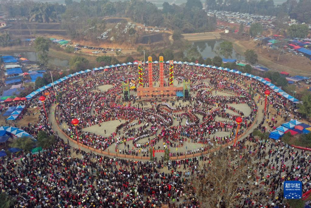 2月5日,在云南省德宏傣族景頗族自治州隴川縣,少數民族群眾載歌載舞,共慶佳節(無人機照片)。