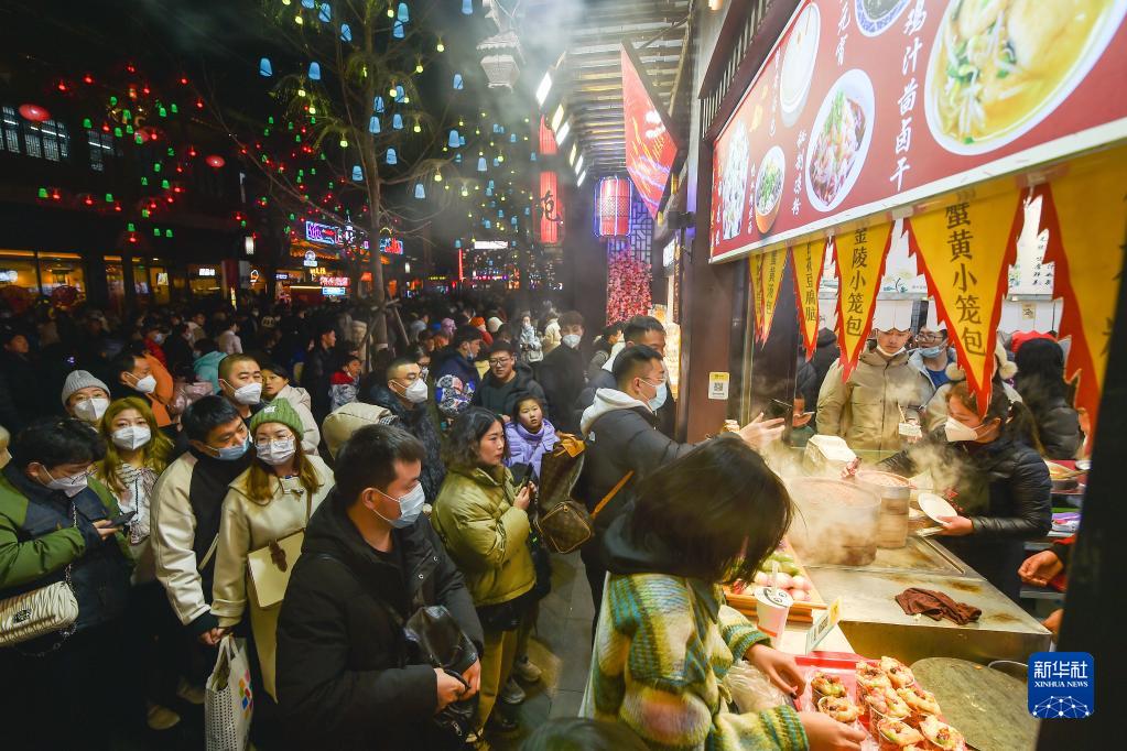 1月28日,游客在南京市夫子廟景區排隊購買特色美食。