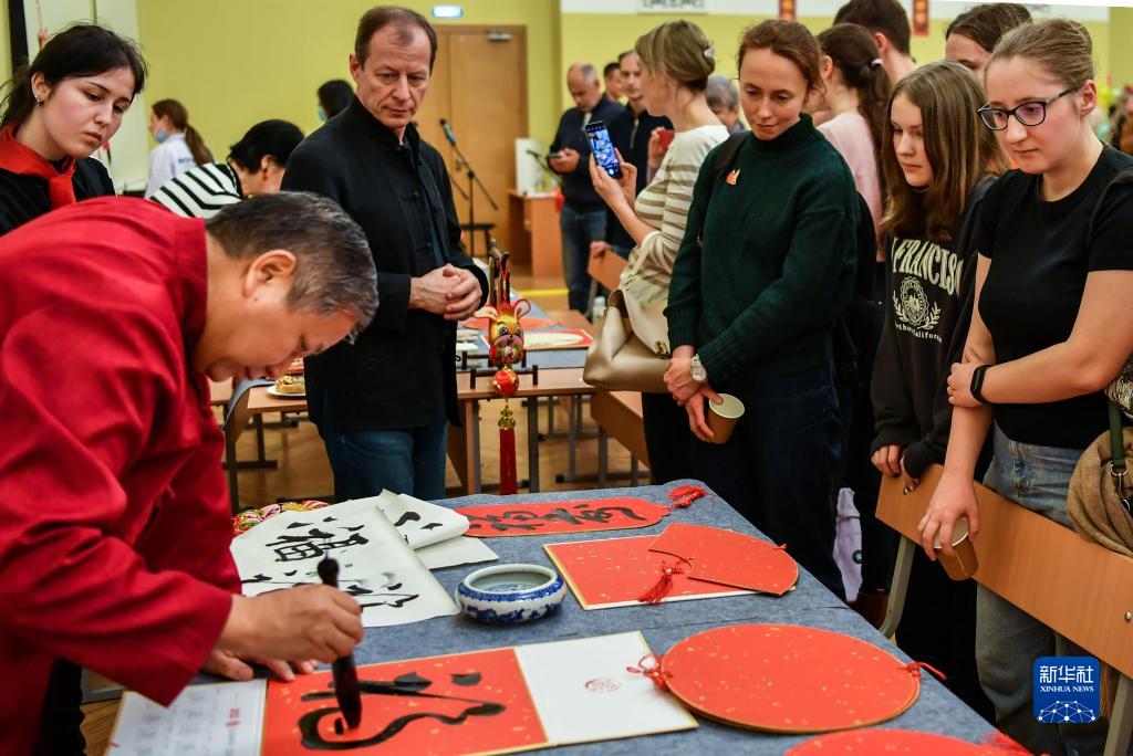 2月3日,在俄羅斯莫斯科國立人文大學孔子學院舉行的慶新春晚會上,人們觀看書法家寫“?!弊?。