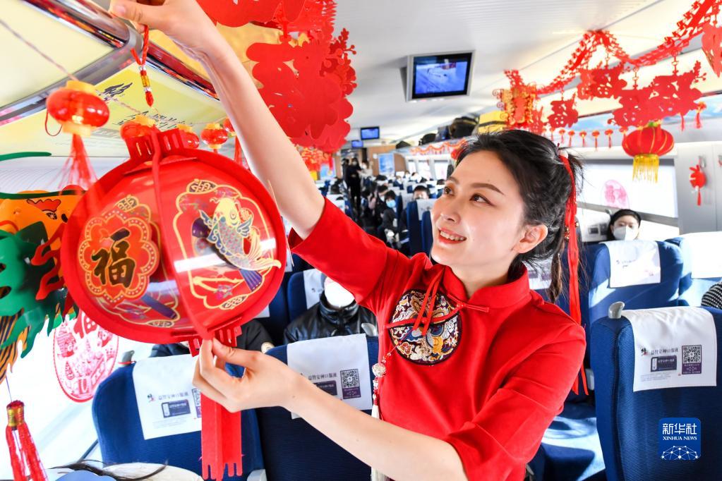 2月4日,沈陽客運段列車工作人員在列車上掛上花燈。
