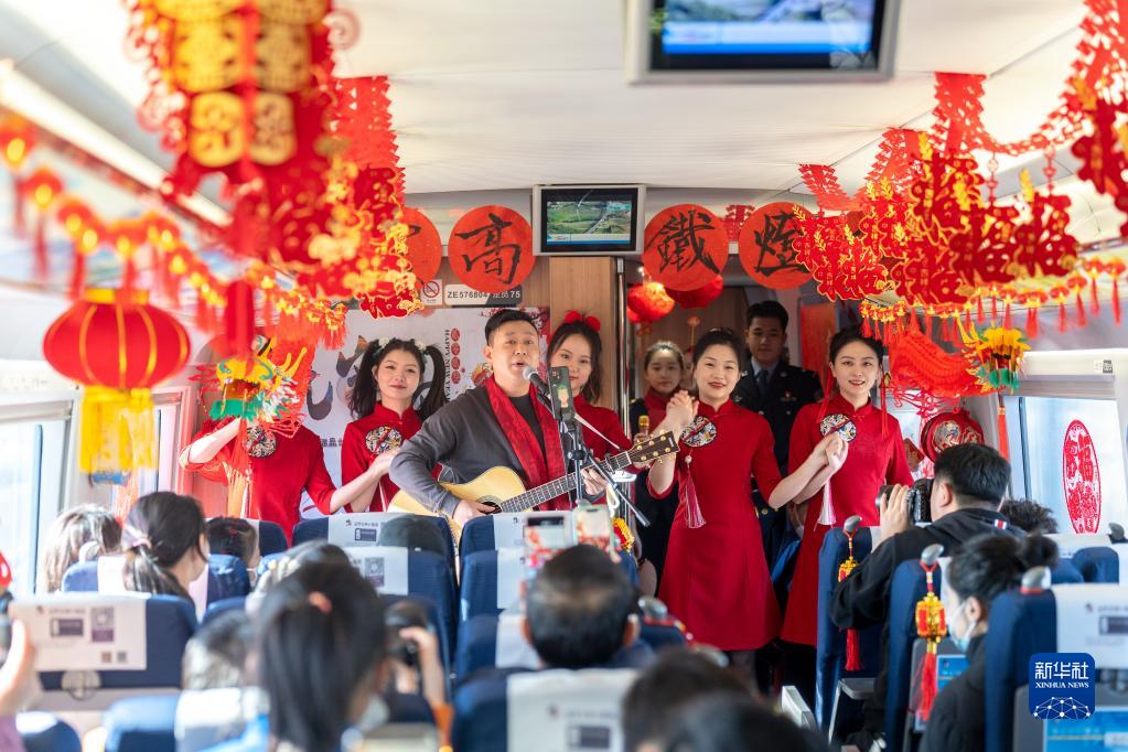 2月4日,沈陽客運段列車工作人員為旅客表演節目。