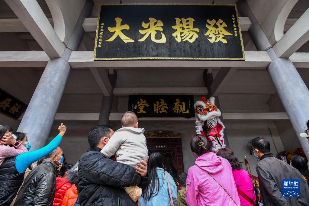 1月12日,在佛山市南海區西樵黃氏宗祠,這里現在也是黃飛鴻獅藝武術館,獅團為游客表演醒獅。