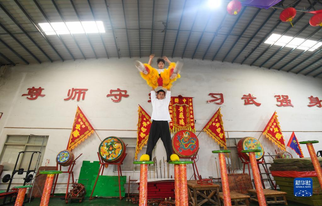 1月13日,在佛山市南海區黃飛鴻中聯龍獅訓練基地,選手在訓練高樁醒獅。