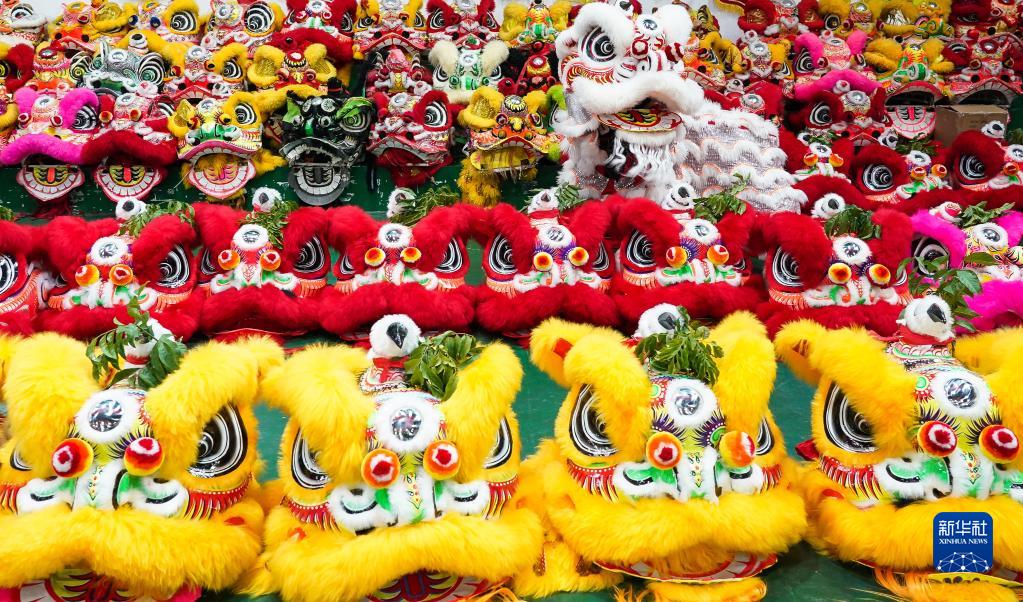 1月13日,在佛山市南海區黃飛鴻中聯龍獅訓練基地,一頭醒獅“淹沒”在身邊的“獅?!崩?。
