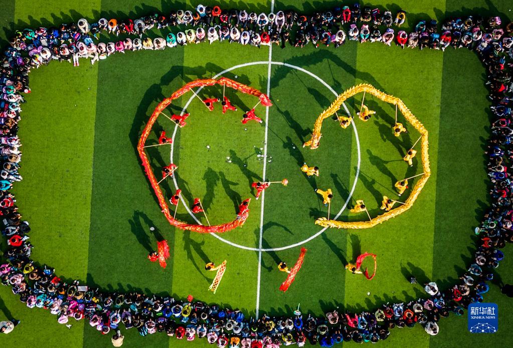 2月5日,在合肥市蚌埠路第二小學,孩子們表演舞龍(無人機照片)。