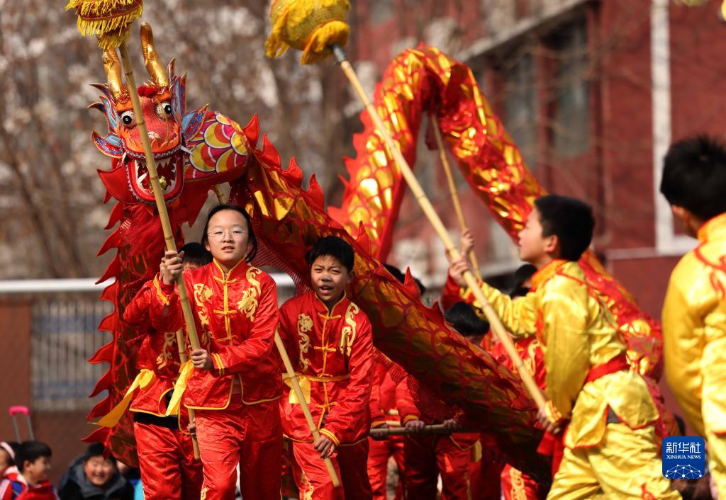 2月5日,在合肥市蚌埠路第二小學,孩子們表演舞龍。