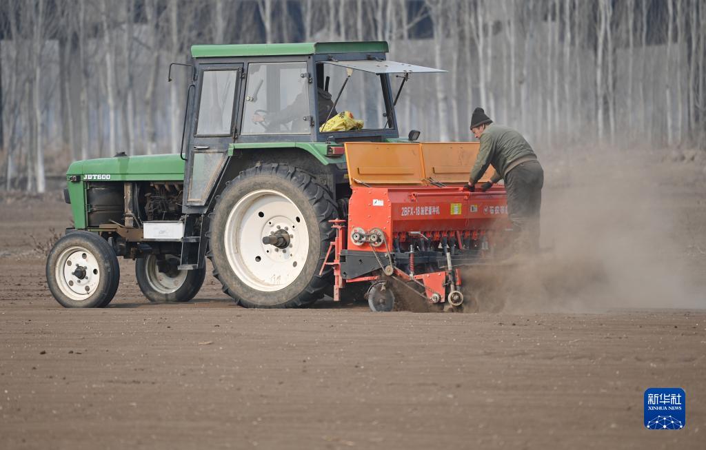隨著氣溫回升,在天津市西青區辛口鎮水高莊村,當地農戶搶抓農時進行春小麥的機械化播種。