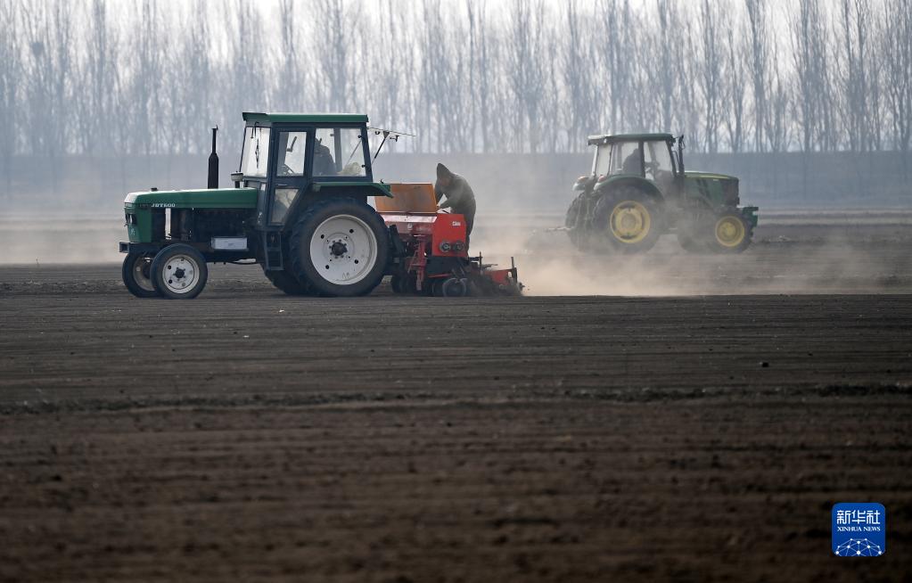 隨著氣溫回升,在天津市西青區辛口鎮水高莊村,當地農戶搶抓農時進行春小麥的機械化播種。