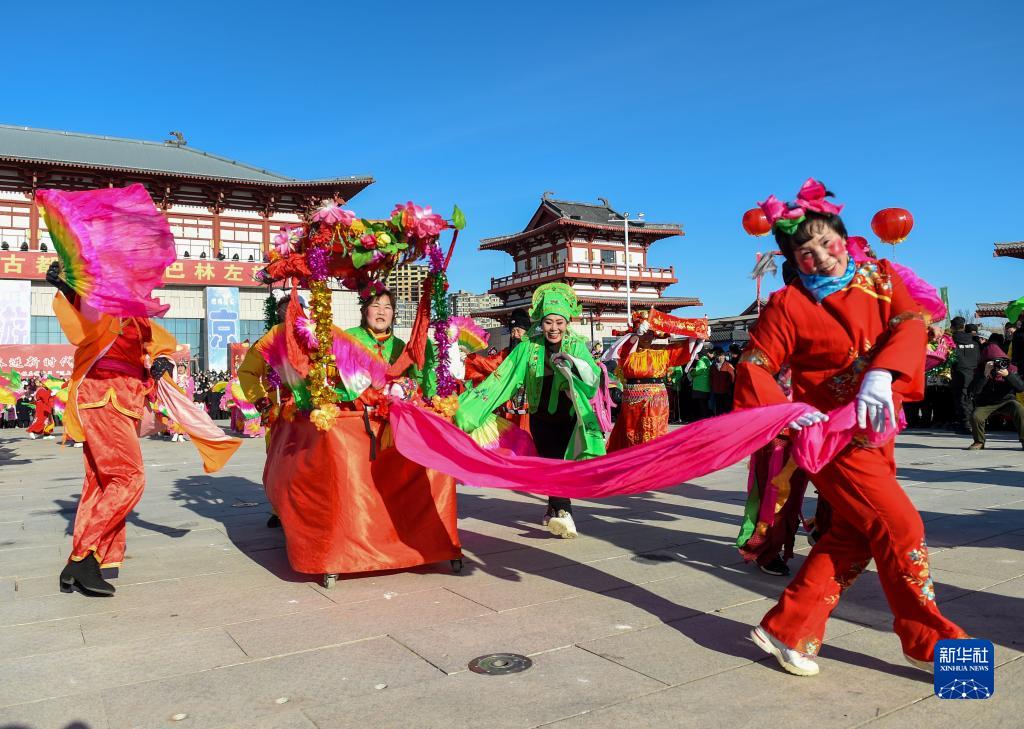2月5日,在內蒙古赤峰市巴林左旗,社火隊員表演劃旱船。