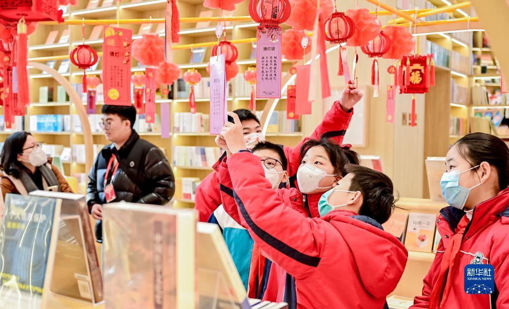 2月5日,孩子們在上海市楊浦區新江灣城街道學悅風詠書社猜燈謎。