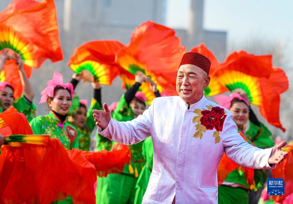 2月5日,在新疆烏魯木齊市米東區人民廣場,社火隊員進行新疆“花兒”表演。