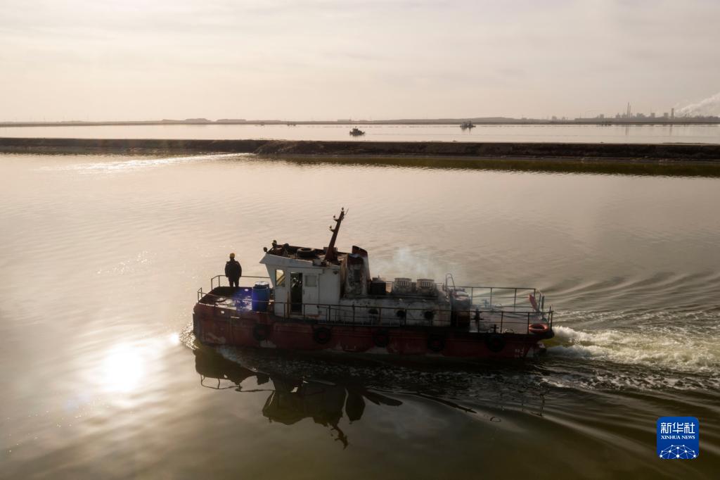 2月2日,賀連福乘坐工作船前往水采船。水采船在劇毒的鹵水鹽田中作業,工作人員每天上下水采船都要通過工作船接駁。