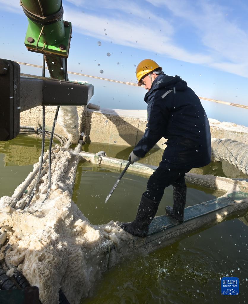 2月2日,賀連福使用工具鏟除附著在船體上的鹵水結晶。