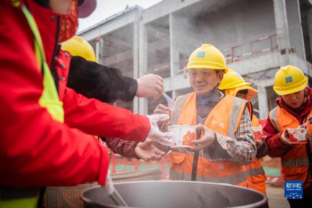 2月5日,在中建三局三公司承建的湖北省孝感楚能新能源項目工地,工人準備品嘗湯圓。