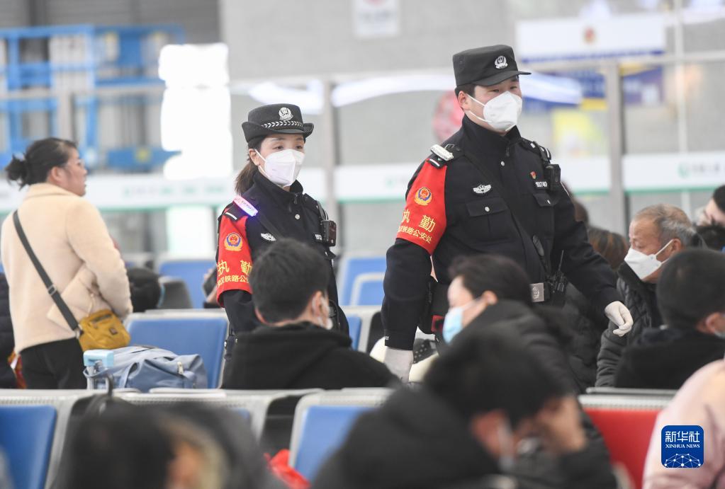 2月5日,武漢鐵路公安處武昌車站派出所民警在武昌站候車大廳值勤。