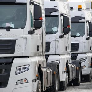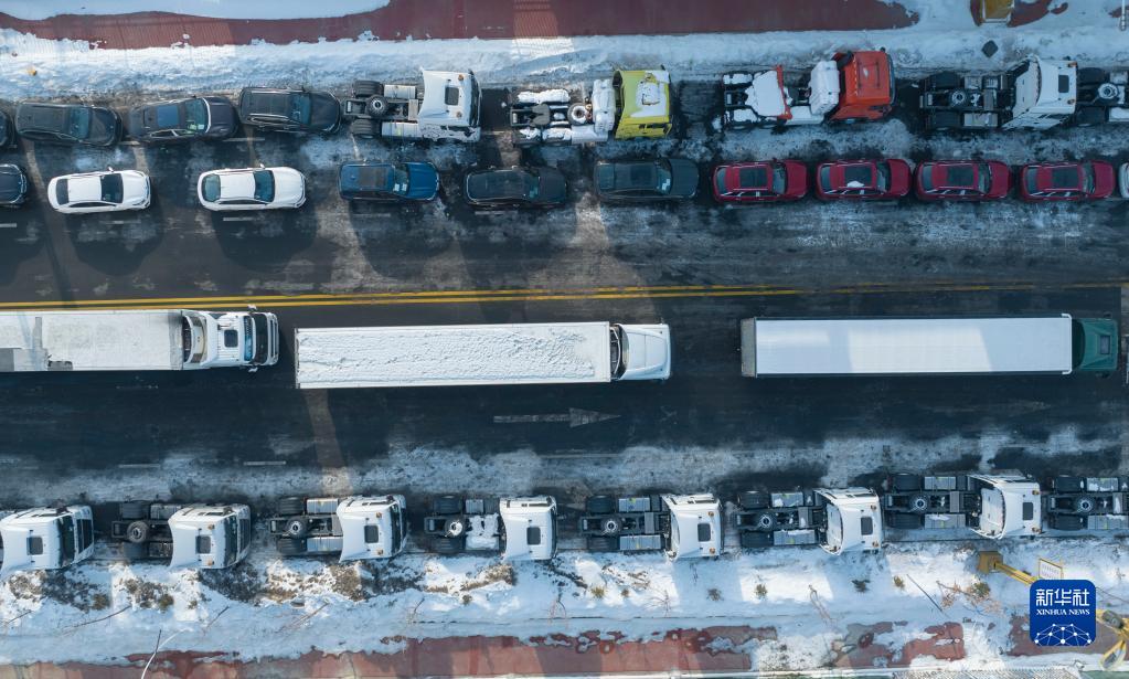 來自哈薩克斯坦的貨車、即將出口的車輛在巴克圖口岸排隊等候出境(2月4日攝,無人機照片)。