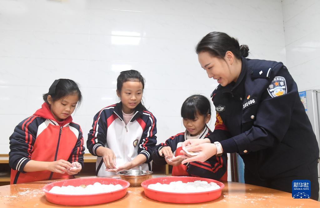 2月5日,在南寧鐵路公安局南寧公安處賓陽站派出所,民警與三姐妹一起包湯圓。家住賓陽縣和吉鎮三叉村的呂秀清、呂秀萍和呂秀玲三姐妹,是當地的留守兒童,派出所青年民警志愿者常常利用業余時間輔導她們學習,疏導心理,至今已經4年。