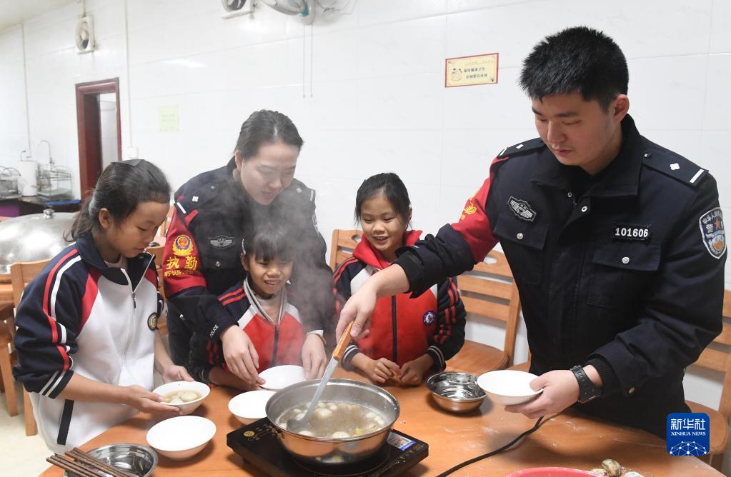 2月5日,在南寧鐵路公安局南寧公安處賓陽站派出所,民警與三姐妹一起煮湯圓。家住賓陽縣和吉鎮三叉村的呂秀清、呂秀萍和呂秀玲三姐妹,是當地的留守兒童,派出所青年民警志愿者常常利用業余時間輔導她們學習,疏導心理,至今已經4年。