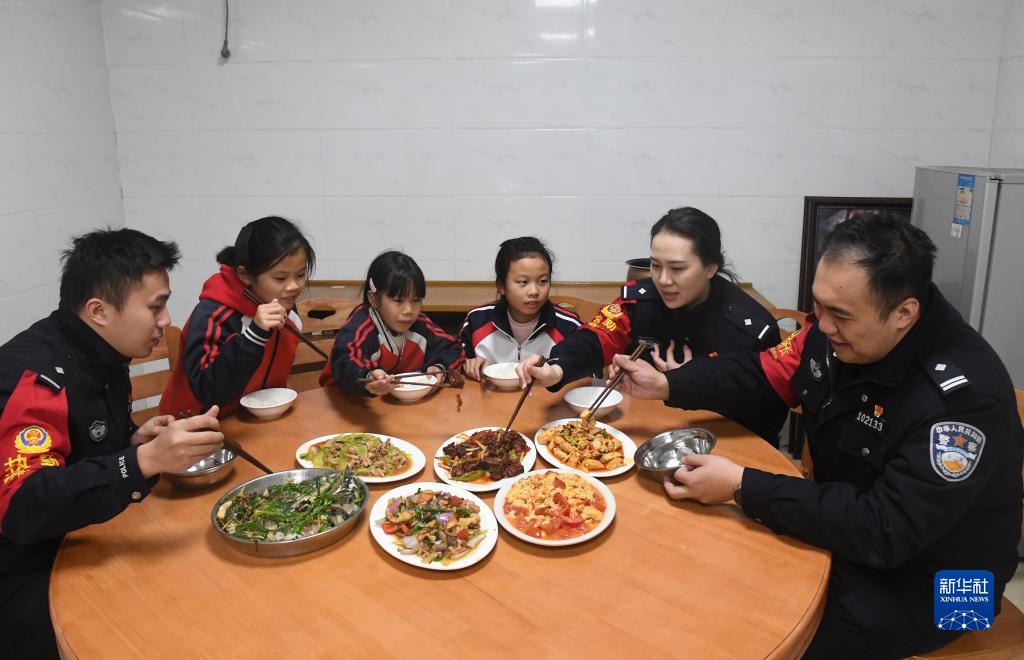 2月5日,南寧鐵路公安局南寧公安處賓陽站派出所民警與三姐妹一起吃午飯。家住賓陽縣和吉鎮三叉村的呂秀清、呂秀萍和呂秀玲三姐妹,是當地的留守兒童,派出所青年民警志愿者常常利用業余時間輔導她們學習,疏導心理,至今已經4年。