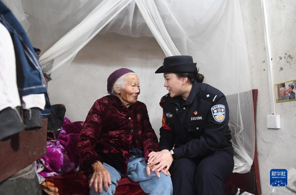 2月5日,在廣西賓陽縣黎塘鎮梁村,賓陽站派出所民警喻戀涵(右)和黃愛明老人聊天。92歲的黃愛明老人,是當地一名五保戶老人。周末和節假日,派出所青年民警志愿者會帶著一些生活用品去看望老人,陪她聊天,幫她做家務等,至今已經14年。