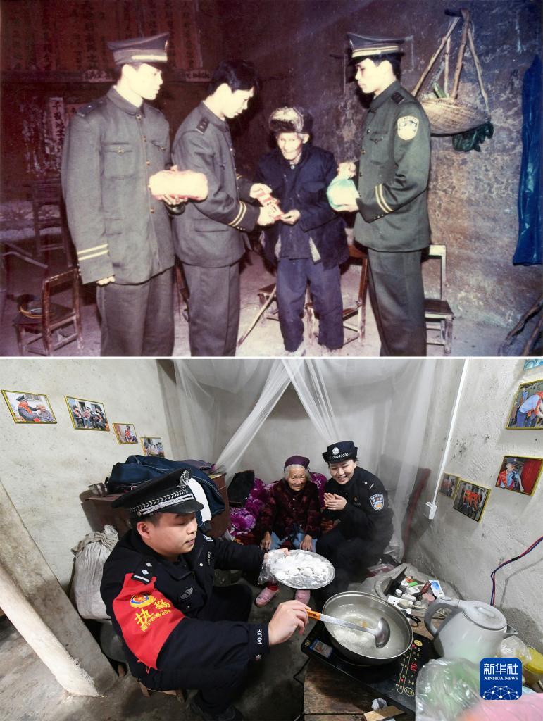 上圖:1990年,原黎塘站派出所(現為賓陽站派出所)青年民警看望姚振安老人。新華社發(賓陽站派出所供圖)