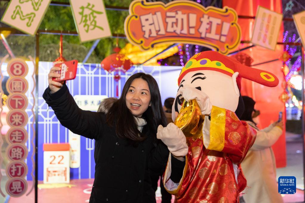 2月4日,在錦江樂園“盛世唐燈市集”,游客和“財神”自拍合影。