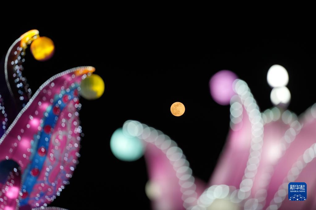 2月5日在北京世園公園拍攝的月亮和花燈。