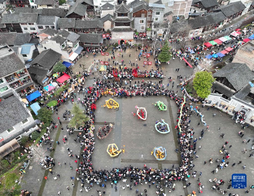 2月5日,人們在貴州省錦屏縣隆里古城觀看“花臉龍”表演(無人機照片)。