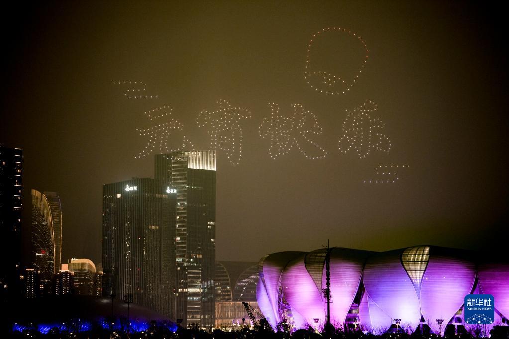 2月5日,無人機群在錢塘江畔的“迎亞運、慶元宵”煙花燈光秀表演中呈現“元宵快樂”字樣。