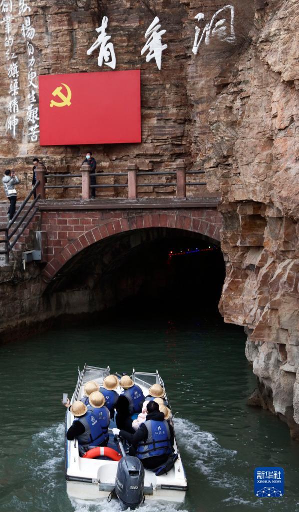 2月5日,游客乘船游覽旗渠景區青年洞。
