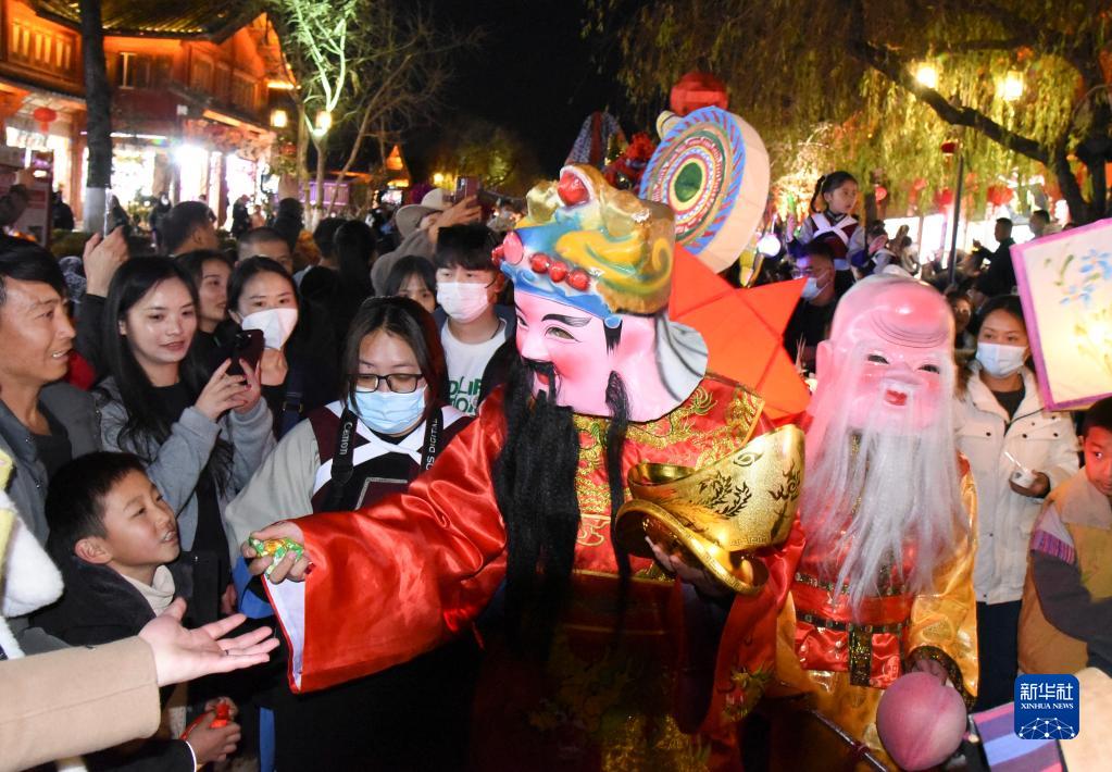 2月5日,在云南省麗江古城的元宵提燈會上,“財神爺”在給游客發糖。