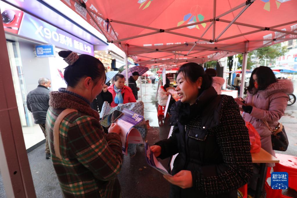 2月5日,在湖南省資興市鯉魚江片區舉行的2023年“春風行動”城鎮失業人員專場招聘會上,求職者(右)了解就業信息。