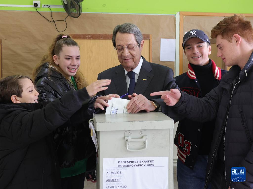 2月5日,現任總統阿納斯塔夏季斯(中)在塞浦路斯利馬索爾的一個投票站投票。