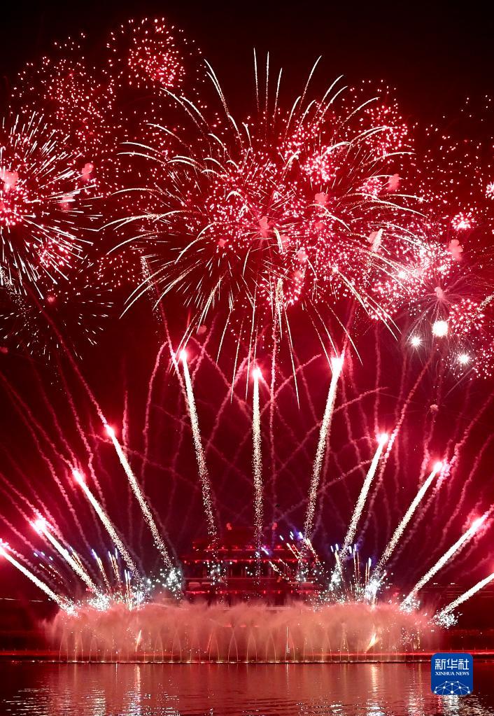 2月5日晚,2023西安曲江上元煙花晚會在大唐芙蓉園舉行。晚會上燈在水里游、人在船中舞、焰火漫天空,西安市勞模及先進工作者、公安和消防及醫護人員等社會各界人士代表千余人和3000名市民代表相聚觀演。