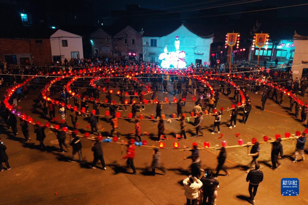 2月5日晚,浙江省東陽市南馬鎮防軍村的村民們在迎龍燈鬧元宵(無人機照片)。