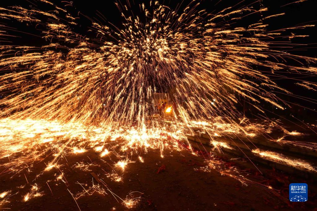 2月5日,民間藝人在貴州省赤水市官渡鎮小廣場表演“打鐵花”。