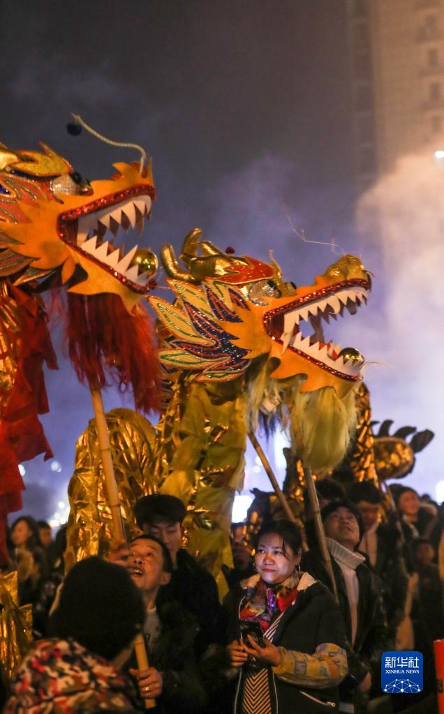 2月5日晚,人們在貴州省玉屏侗族自治縣舞陽廣場舞龍。