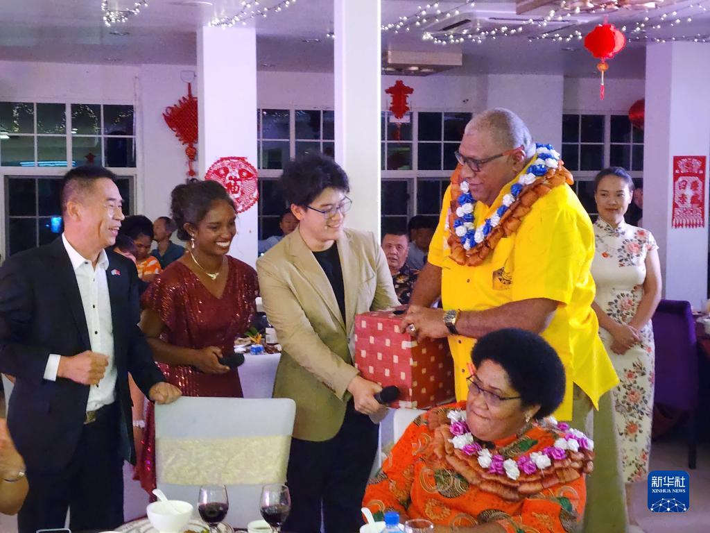 2月5日,斐濟總統卡托尼韋雷在蘇瓦的歡樂春節元宵聯歡會上為嘉賓抽獎。
