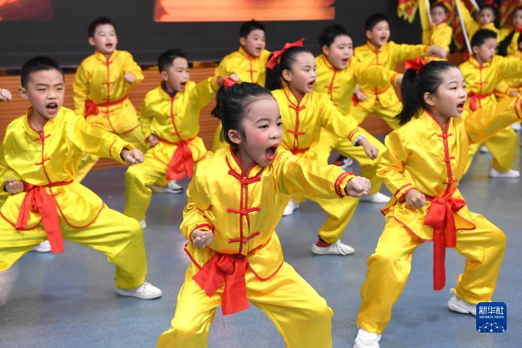 2月6日,學生在廣西南寧市濱湖路小學教育集團濱湖校區開學儀式上表演武術。