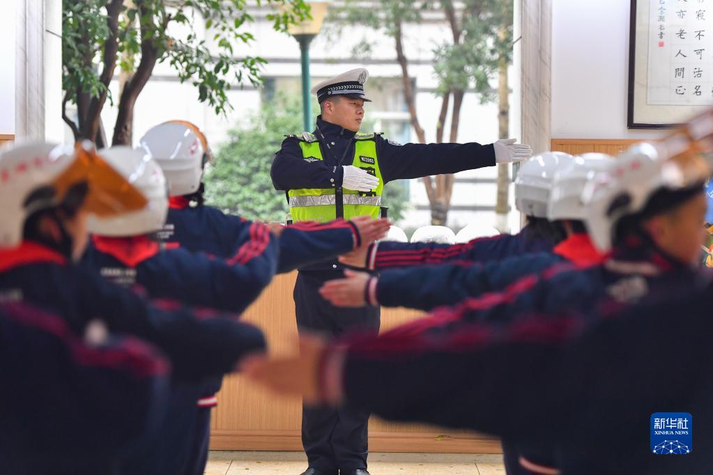 2月6日,在長沙市望城區長郡月亮島學校,交警帶著學生們體驗交通指揮手勢。