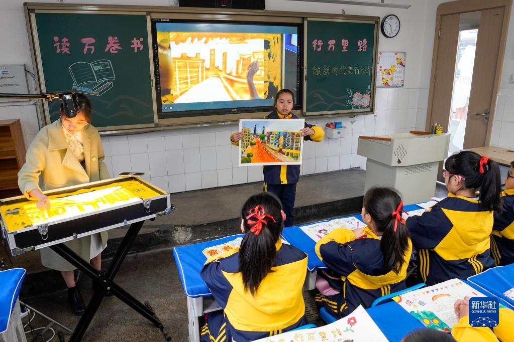 2月6日,在重慶市九龍坡區鐵路小學五年級2班的開學第一課上,一名學生在外援老師的沙畫配合下,結合自己的繪畫作品講述寒假期間的旅行見聞。學校希望通過開展“美學秀”開學第一課引導學生發現生活之美和閱讀的樂趣。