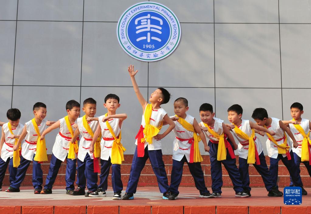2月6日,湖北省宜昌市秭歸縣實驗小學學生表演獨具當地特色的《峽江船工號子》。